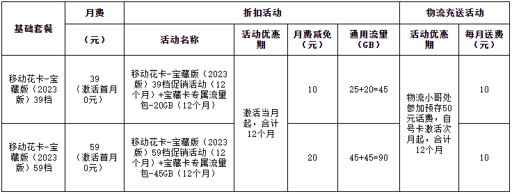 - 优惠二:(固定)首年优惠10元,优惠至29元/月,办理当月生效,到期恢复。移动花卡-宝藏版(2023版)39档促销活动(12个月)