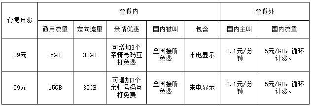 月费39元/月。30GB定向流量,5GB通用流量,可增加3个亲情号码互打免费。套餐外语音0.1元/分钟;套外流量5元1GB,循环计费。