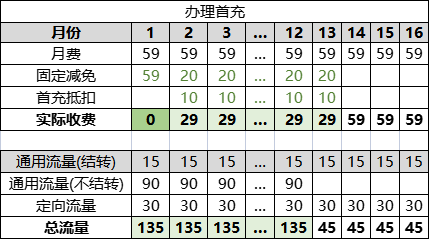 - 优惠一:(固定)首月免月费(部分商家宣传为:激活赠送60元体验金抵扣首月月费)