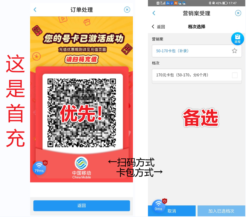 2.卡包办理(充50得120:50直充,20元*6月)扫不出码才用!