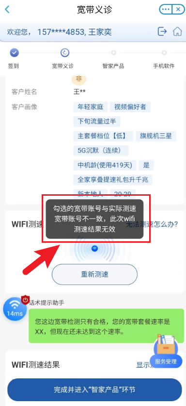• 图示宽带运营商 与 Wifi运营商 相同,即 路由器中实际绑定的宽带账户,需要与测速时选中的账号一致