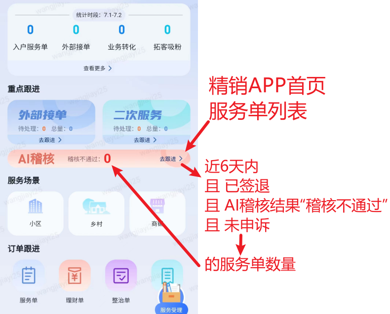2.精销首页展示“稽核不通过”且未申诉的服务单数量。